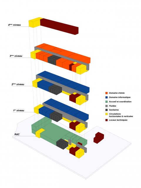Le bâtiment s’accroche au site sur l’axe Nord-Sud parallèlement au tramway actuel et futur qui à terme reliera CAEN à EPRON plus au Nord. Le projet de l’ENSI-CAEN pourra ainsi se développer selon cet axe dans une trajectoire parallèle au futur tramway et dans une logique d’occupation progressive du terrain disponible.